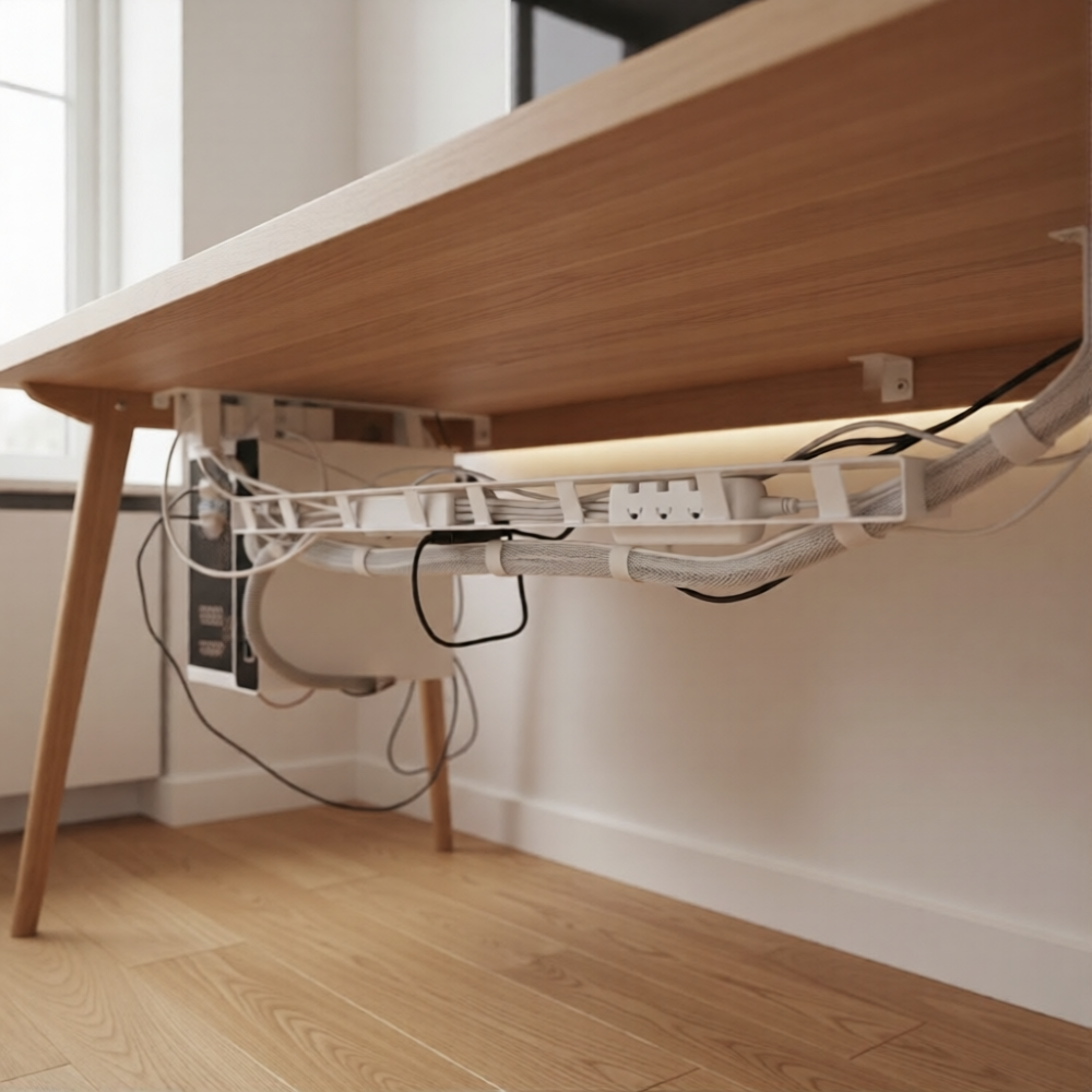 Manfaatkan J-Channel: Pasang saluran kabel (raceway) di dinding atau bawah meja untuk menyembunyikan kabel yang menjuntai.