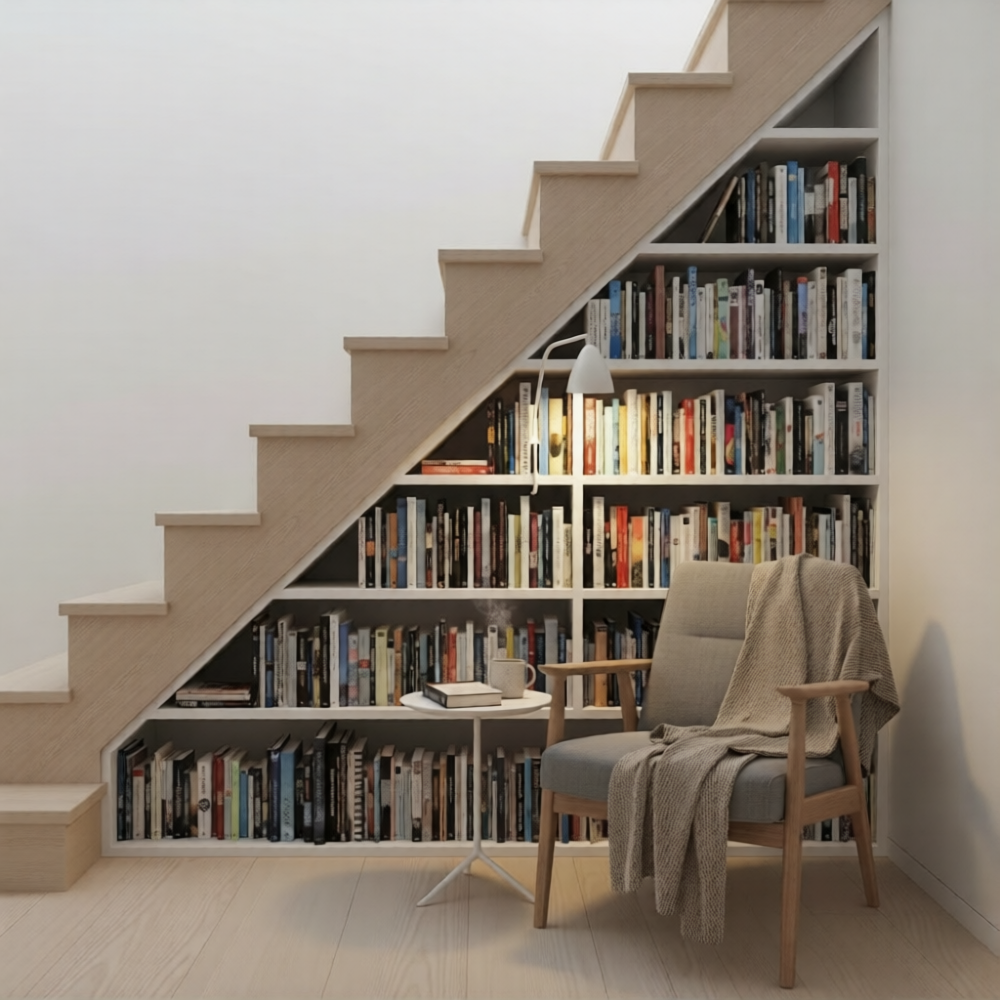 Mini Library atau Rak Buku: Buat rak custom yang ngikutin kemiringan tangga. Selain bikin rapi, ini bisa jadi focal point yang estetik banget di ruang tamu.