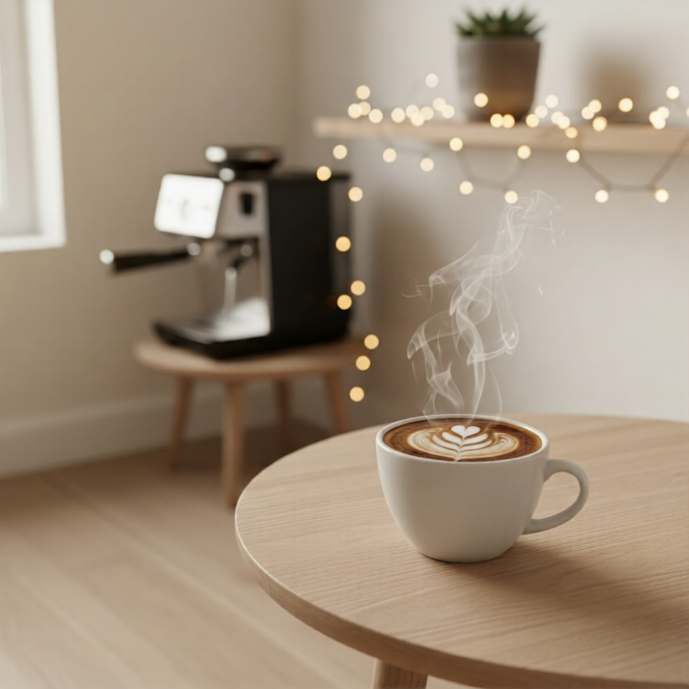 Aroma: Gunakan scented candle atau diffuser dengan aroma kopi atau vanilla.